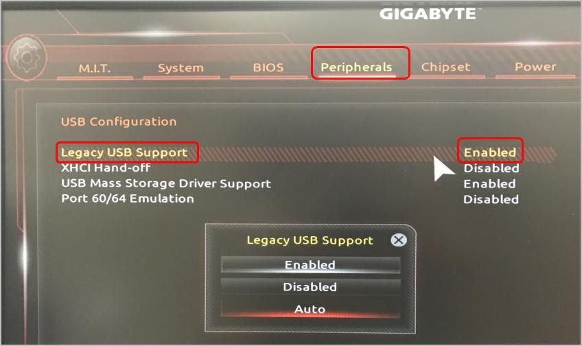 - На панели конфигурации USB нажмите клавиша со стрелкой вниз выбирать Устаревшая поддержка USB. Затем нажмите Войти установить его Включено.