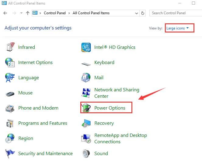 4) Теперь на клавиатуре нажмите Windows кнопку, затем выберите Панель управления. Просмотр по Большие иконки и выбрать Варианты питания.