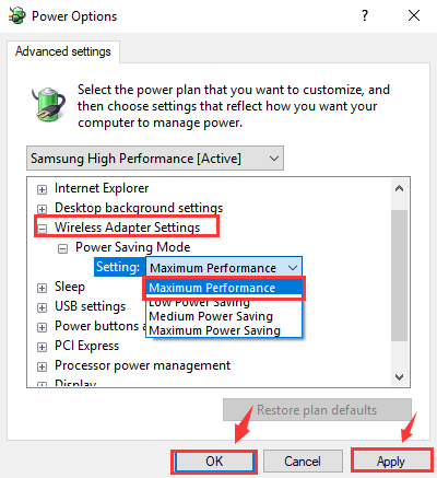 7) Найдите и разверните Настройки беспроводного адаптера а затем расширить Режим энергосбережения. Выберите из выпадающего меню Максимальная производительность. Затем нажмите Применять а также Хорошо сохранить изменения.