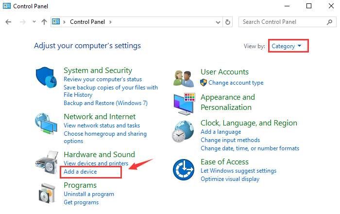 1) На клавиатуре нажмите Windows кнопку, а затем выберите Панель управления. Просмотр по категория а затем выберите Добавить устройство под Оборудование и звук вещь.