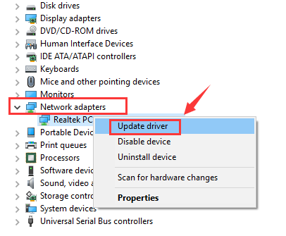 2) Найдите и раскройте категорию Сетевые адаптеры. Затем щелкните правой кнопкой мыши сетевой драйвер, который вы видите здесь, и выберите Обновить драйвер.