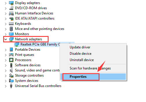2) Найдите и разверните Сетевые адаптеры категория. Затем щелкните правой кнопкой мыши на устройстве, которое вы видите здесь, и выберите свойства.