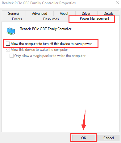 3) Затем перейдите к Управление энергопотреблением и убедитесь, что поле для Разрешить компьютеру выключать это устройство для экономии энергии не отмечен. Затем нажмите Хорошо сохранить изменения.