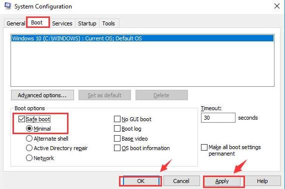 2) Перейдите к ботинок категорию, затем выберите Безопасная загрузка> Минимальная. Затем нажмите Применять а также Хорошо сохранить изменения.