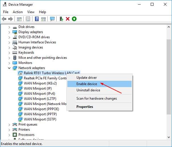 3) Подождите несколько секунд, затем снова щелкните правой кнопкой мыши на драйвере карты Wi-Fi. И на этот раз нажмите Включить устройство.