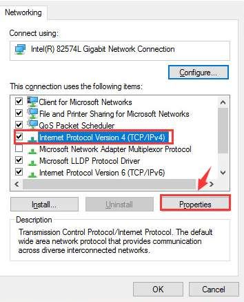 4) Выберите Интернет-протокол версии 4 (TCP / IPv4) и нажмите свойства.