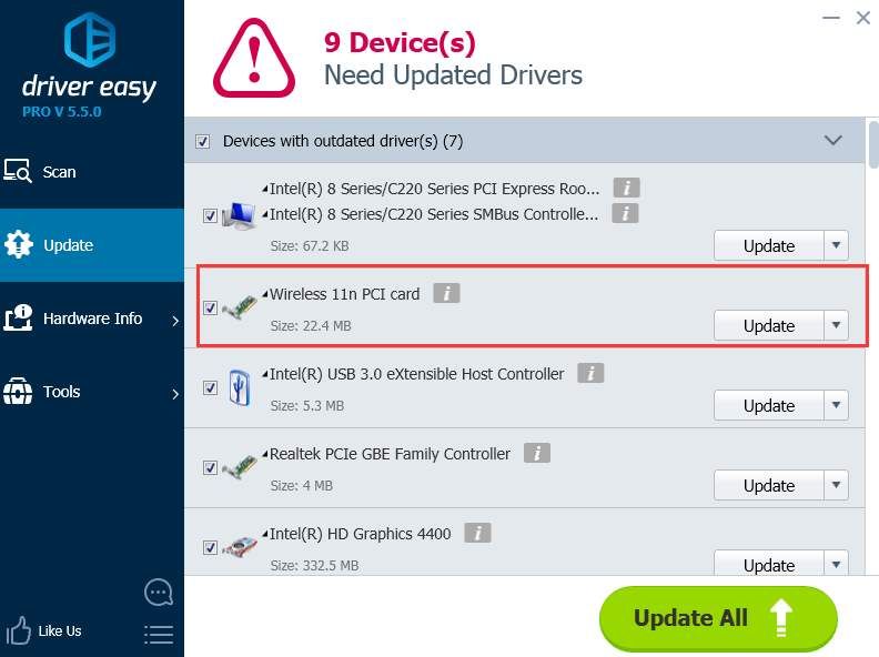 3) Нажмите Обновить кнопка рядом с помеченным драйвером сетевой карты для автоматической загрузки и установки правильной версии этого драйвера (вы можете сделать это с помощью бесплатной версии).