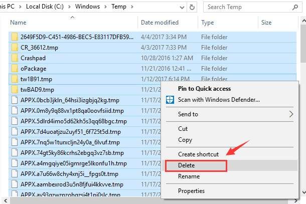 4) В этой папке вы увидите много временных файлов. Нажмите Ctrl + A в то же время, чтобы выбрать все файлы, затем щелкните правой кнопкой мыши и нажмите удалять.