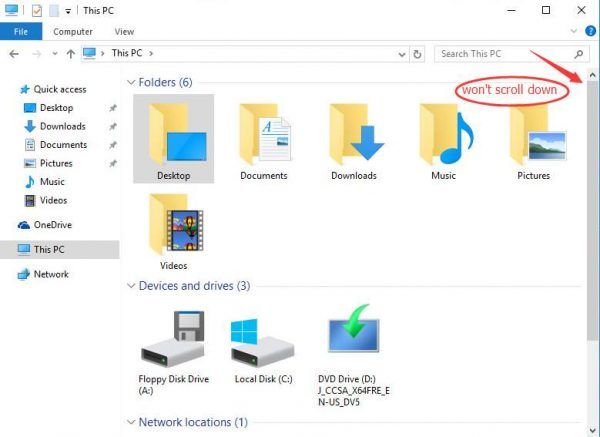 Позвольте мне быть более ясным, чтобы увидеть, соответствует ли описание вашей ситуации: вы открываете папку в своем Проводник, скажем так, чтобы увидеть фотографии. После того, как вы закончили просмотр первого экрана изображений, вы хотите немного прокрутить вниз, чтобы увидеть больше, но вы обнаружите, что полоса прокрутки сбоку не сдвинется с места, она просто продолжает прыгать на верхнюю позицию независимо от того, сколько раз вы катите колесо мыши.