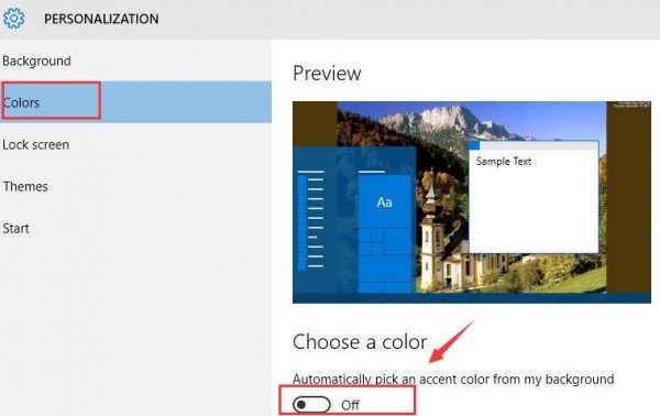 2) В левой части панели выберите Цвета, и на правой стороне панели, убедитесь, что опция Автоматически подбирать и акцентировать цвет с моего фона вариант слайд от.