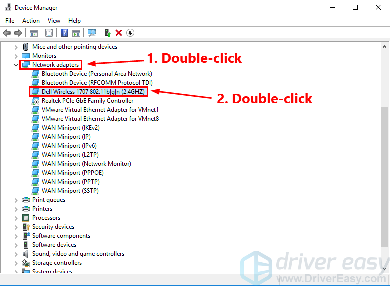 - Двойной щелчок Сетевые адаптеры расширить список. Затем дважды щелкните адаптер беспроводной сети (устройство, название которого содержит слово «беспроводной»).