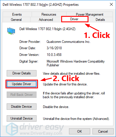 - Во всплывающем окне перейдите к Водитель Вкладка. Затем нажмите Обновить драйвер.