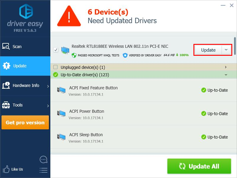 - Нажмите Обновить Рядом с адаптером беспроводной сети автоматически загружается правильная версия его драйвера, затем вы можете установить его вручную. Или нажмите Обновить все для автоматической загрузки и установки правильной версии всех драйверов, которые отсутствуют или устарели в вашей системе (это требует Pro версия — вам будет предложено обновить, когда вы нажмете Обновить все. Ты получаешь полная поддержка и 30-дневный возврат денег гарантия).