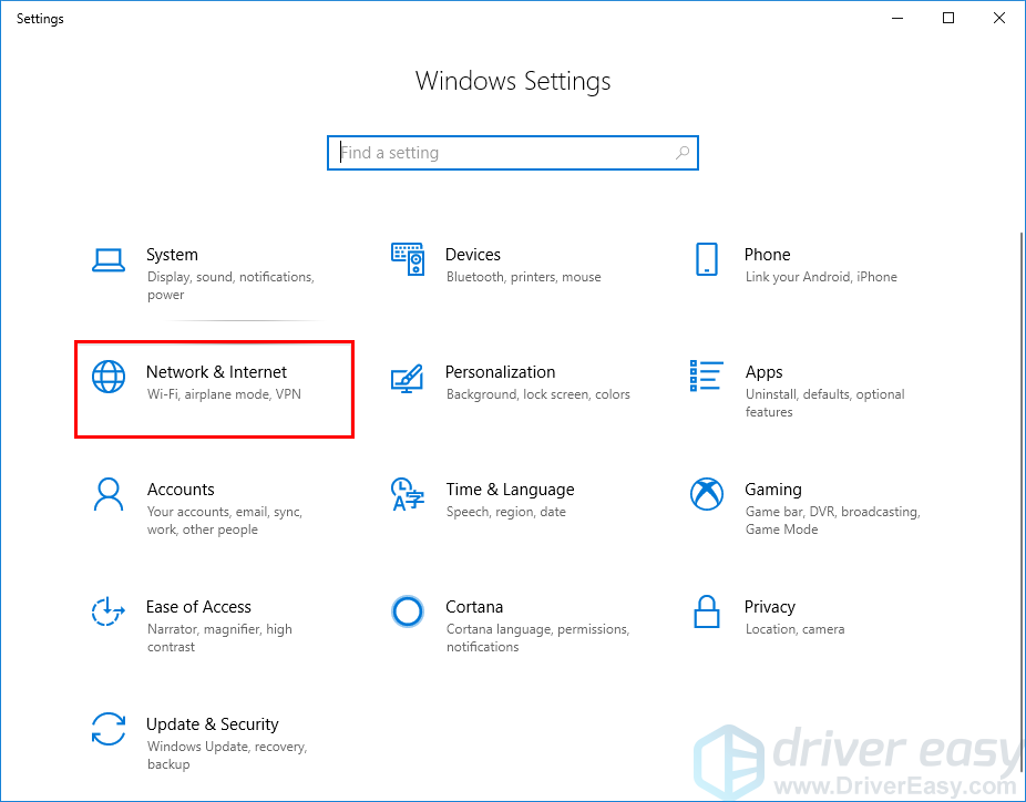 - На клавиатуре нажмите ключ с логотипом Windows а также я одновременно открыть Настройки Windows. Затем нажмите сеть интернет.