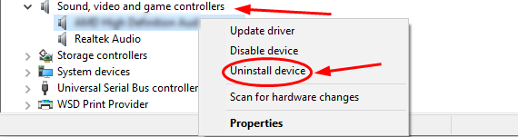 3) Двойной щелчок Контроллер звука, видео и игр и щелкните правой кнопкой мыши на вашем аудиоустройстве, чтобы выбрать Удалить устройство.