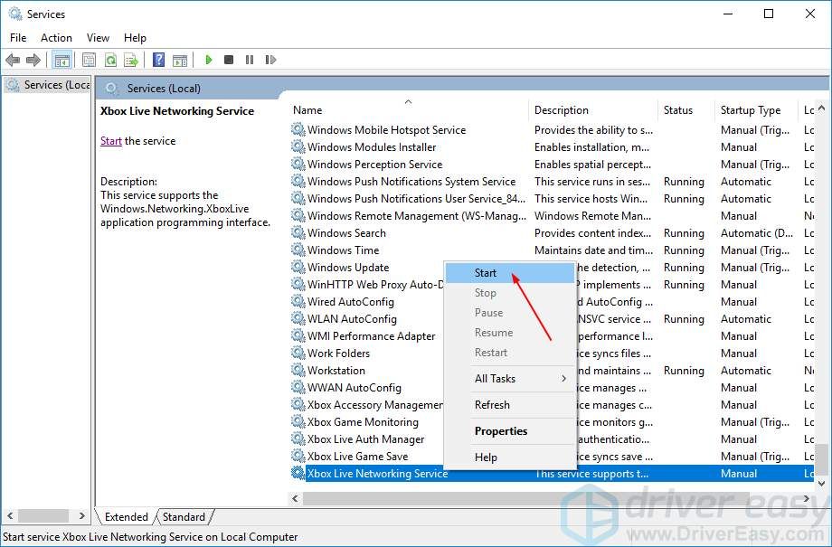 5) Теперь вернемся к окну Сервисы, щелкните правой кнопкой мыши на Сетевая служба Xbox Live снова. На этот раз выберите Начните.