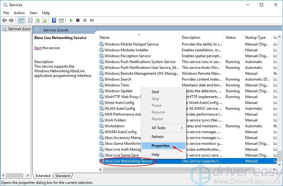 3) Прокрутите вниз в открытом окне Сервисов. Найдите и щелкните правой кнопкой мыши на Сетевая служба Xbox Live. Затем выберите свойства.