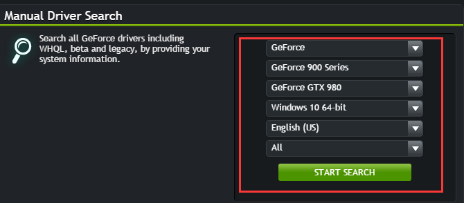 4. В разделе «Поиск драйверов вручную» выберите нужную серию (Geforce 900 Series), название продукта (Geforce GTX 980) и версию операционной системы (см. Как получить версию операционной системы). После этого нажмите НАЧАТЬ ПОИСК кнопка.