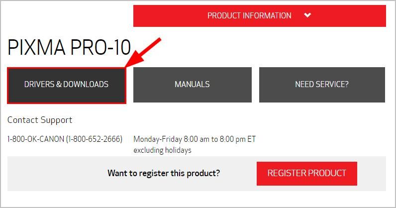 - Нажмите ВОДИТЕЛИ ЗАГРУЗКИ под названием вашей модели. (Здесь я возьму PIXMA PRO-10 в качестве примера.)
