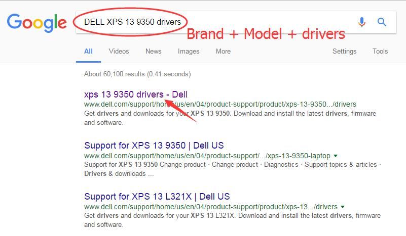 1) Откройте ваш браузер. Тогда напечатайте DELL XPS 13 + Модель + драйверы » в окно поиска и нажмите Войти. Нажмите на результат, с которым ваши драйверы продуктов Dell dell.com на вершине.