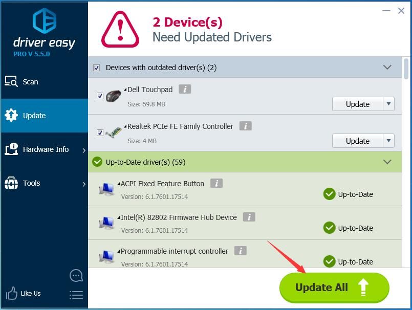 3) Нажмите Обновить все для автоматической загрузки и установки правильной версии всех драйверов, которые отсутствуют или устарели в вашей системе (для этого требуется версия Pro — вам будет предложено выполнить обновление при нажатии кнопки «Обновить все»).